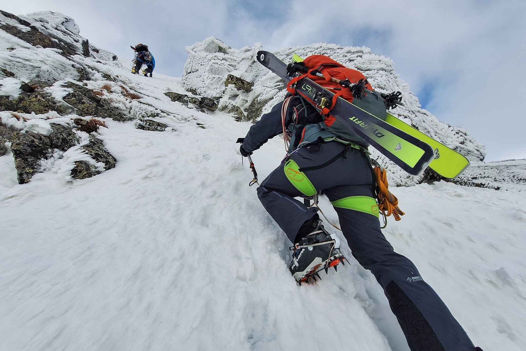 Následuje zhruba 300 metrů ve sněhu. Balíme lana do batohů a opatrně stoupáme šikmo nahoru tam, kde tušíme vrchol. Pekelně se soustředíme, protože překračujeme jeden strmý žlab za druhým a pod mačkami není jen firn, ale také zmrzlá tráva a skalní plotny.
