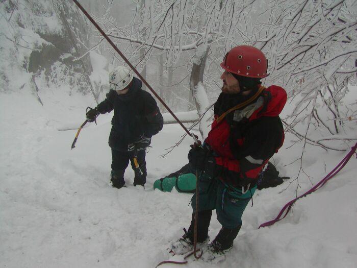 Zbyněk může až v soboto v 11nást. To je pozdě a tak trojce Renča, Radek a já nezbývá než jet busem. Sobotní ráno v Hejnici nás přivítá teplem a rozbředlým sněhem. Kráčíme nahoru Štolpišskou silnicí, je mlha, kvalita sněhu se s přibývajícími metry nadmořské výšky zlepšuje a tak doufáme že z ledů něco zbylo. Zastavujeme se pod prvním ledem, nasadíme sedáky, mačky, obejdeme spodní malý ledový výšvih a míříme k tomu většímu hornímu. Chtěl by si tam něco dát na prvním, ale ledu je dnes výrazně méně než minule. Ten směr, který se mi minule zalíbil byl mokrý, málo zaledněný a vůbec nevypadal hezky. Naštěstí vlevo se naše kus kvalitnějšího ledu. Dole kolmá, nahoře ukloněná stěnka s už vykopanými vstupy nebyla pro mne větším problémem. Tedy až na to, že nahoře byl led 10 cm od skály. Tak jsem to lano hodil shora a za začali jsme to okopávat nahoru dolů. Po chvíli se objevil maník s cepíny ostrými jak břitva. Chvíli si s námi povídal, bouldroval a taky si stěžoval na nějakého novináře, který píše o ledech v Labáku a že jeho kamarád by mu nejradši rozbil hubu. Ujistili jsme ho, že jeho kamarád je v pořadí. Pak se sólo vydal vzhůru, ale na dutých deskách nahoře znejistěl a tak jsme mu raději hodili lano shora. Za záchranu života nám děkoval a půjčil nám své cepy. Vyzkoušeli jsme si lezení bez poutek, stěnka nebyla těžká tak to šlo. Několikrát si ji přelezl na našem laně i náš nový kamarád. Pak se odporoučel a odešel. Stěnka nás omrzela a tak jsme šli zkusit něco vedle. Zde jsme si to od samého začátku hodili shora. Lezci před námi to sice lezli na prvním, ale utrhli solidní kus ledu. Led je zde mnohem horší a je problém se vůbec k tomu rampouchu dostat. Někde je měkká břečka, kterou lze cepínem seškrábat ze skály a tam kde je led, tak se po zaseknutí piklu odtrhne celá deska. Ani samotný rampouch není o moc lepší, je to tenká vrstva ledu 5 cm od skály. Po prvním zaseknutí cepín mizí až po hlavici v ledu, ještě, že jsem na druhým. Renča to ani nezkouší a jdeme zkusit spodní výšvih. Ten je víceméně podobný předcházejícímu ledu. Dáme si to každý jednou a konstatujeme, že Srbsko bude na neděli lepší zábava. Balíme a jdeme na vlak. Cestou vlakem pojídáme zásoby, konzumujeme lahváče a potkáváme další dva zoufalce, vracející se z ledů. Byli v Kořenově a ledu je tam tak třetina co před dvěma týdny. Jestli nenastane výrazné dlouhodobé ochlazení je letošní neslavná ledařská sezóna u konce. Uložte pikle na dno skříní k dlouhému letnímu spánku, snad až je v zimě zase vytáhnete bude to lepší.