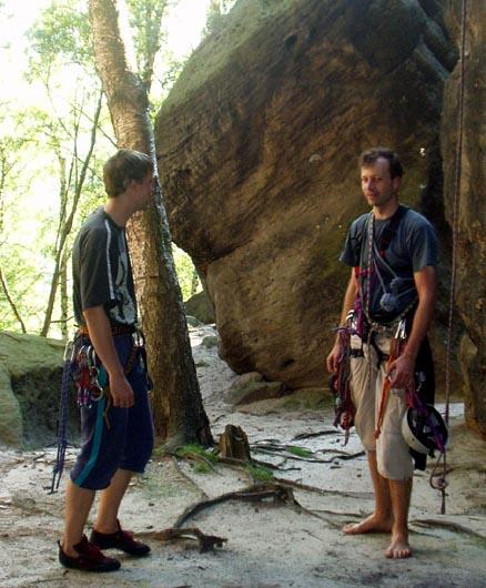 Sraz byl v sobotu brzy ráno a kupodivu byl na místě jako první Brto - což je jev vskutku nevídaný (pravda Lukáš předtím vyhrožoval, že nebude na nikoho čekat - a sám přijel o deset minut pozdě.). Pod vidinou časného vstávání se nikdo neopil a tak jsme na místo dorazili poměrně brzy. Naše oblast se jmenovala Pfaffenstein a nacházela se kousek od Konigsteinu. Chvíli nám sice trvalo, než jsme našli nějaké lezitelné cesty, ale pak to stálo za to. Klasifikace tu je o poznání měkčí než třeba v Tisé, takže mnohá ega se cítila polichocena.Cesty byly vesměs dlouhé, krajinově velkolepé a chrochtací. Krásné lezení se spoustou chytů. Tady je třeba poprvé poděkovat Lukasovi, který našel v průvodci úžasné rajbasy klasifikace VIIIa a IXa. Protože je smardlavá veverka, nahnal do nich Brta, který se nejdřív taky trochu bál a první rajbák oprasil. Pak se ale pochlapil a druhý dal čistě, pravda až po té, co si ho trochu na nečisto vyzkoušel. My ostatní jsme se vozili za ním a různě chrochtali blahem, bečeli a volali kurva Brťánku ty jsi ale negr.