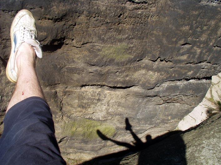 Sraz byl v sobotu brzy ráno a kupodivu byl na místě jako první Brto - což je jev vskutku nevídaný (pravda Lukáš předtím vyhrožoval, že nebude na nikoho čekat - a sám přijel o deset minut pozdě.). Pod vidinou časného vstávání se nikdo neopil a tak jsme na místo dorazili poměrně brzy. Naše oblast se jmenovala Pfaffenstein a nacházela se kousek od Konigsteinu. Chvíli nám sice trvalo, než jsme našli nějaké lezitelné cesty, ale pak to stálo za to. Klasifikace tu je o poznání měkčí než třeba v Tisé, takže mnohá ega se cítila polichocena.Cesty byly vesměs dlouhé, krajinově velkolepé a chrochtací. Krásné lezení se spoustou chytů. Tady je třeba poprvé poděkovat Lukasovi, který našel v průvodci úžasné rajbasy klasifikace VIIIa a IXa. Protože je smardlavá veverka, nahnal do nich Brta, který se nejdřív taky trochu bál a první rajbák oprasil. Pak se ale pochlapil a druhý dal čistě, pravda až po té, co si ho trochu na nečisto vyzkoušel. My ostatní jsme se vozili za ním a různě chrochtali blahem, bečeli a volali kurva Brťánku ty jsi ale negr.
