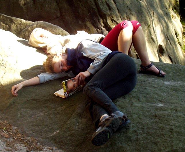 Ačkoliv šla většina lidí spát poměrně brzy, ráno se všichni váleli a moje hrůzné očekávání, že nás Lukáš začne v osm tahat ze spacáků, se nenaplnilo. Dokonce se válel déle než Tok a přiznal, že nam tom mrcasení něco je. I přes značnou opotřebovanost prstů a občasné dešťové přeháňky jsme nakonec vylezli asi pět nebo šest cest včetně výživného sedmičkového traverzu (který by si určitě zasloužil nějaké písmenko navíc) a vraždy VIIIc, kterou všichni oprasili co to dalo. Brto i Tok se nakonec vzmátožili a také začli lízt, přičemž Tok vytáhl jednu celkem nepříjemnou šestku.