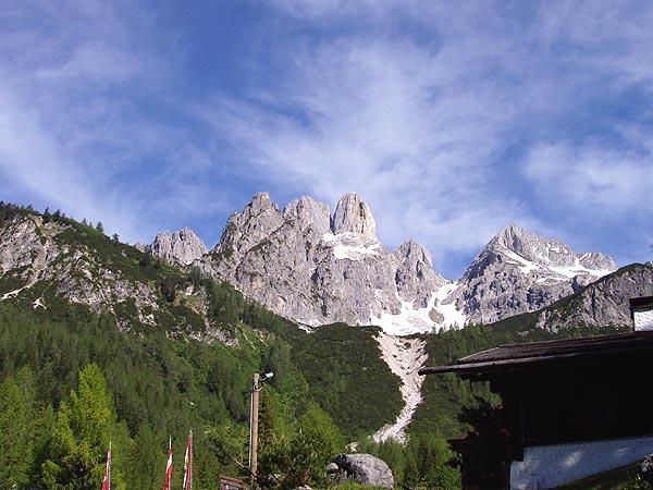 Večer se sice trochu honili mraky, ale úterní ráno bylo opět nádherně. Vrazili jsme na Niederes Grosswandeck s cílem vylézt Fingerkante. Nástupový komín byl ale mokrý a z části ještě vyplněn sněhem. Změnili jsme tedy cestu na JV hřeben 3+, neměli jsme sice nákres ani popis, ale cesta byla vybavena nýty, které nás vedly až na vrchol. Sestup byl tentokrát trochu dobrodružnější. Po návratu jsme šli na chatu na večeři. Paní Steinerová se opět ptala Martina kde jsme byli a on opět nevěděl. Při výběru jídla jsme museli spoléhat na Kubovu a Martinovu němčinu. Oba dva si vybrali jakýsi sýr, jaké bylo jejich překvapení, když dostali opečený luncheon.