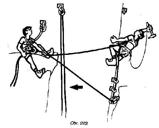 5. Konečně technika pro nejdelší a nejtěžší traverzy, kdy slaňují oba lezci (Obr. 222, 223 a 224) - postup je dobře patrný z obrázků, nesmíme však zapomenout na jištění prusíkem (opět máme plné ruce práce s lanem a chyty, případně kladivem a skobami).