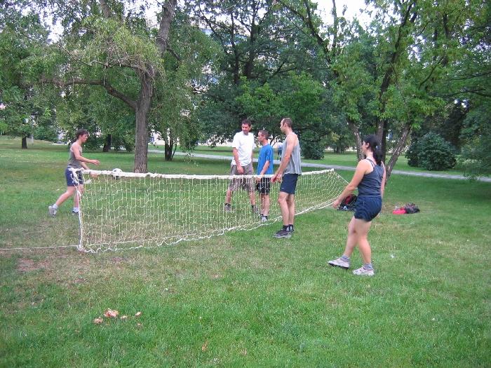 Skupinku hráčů jsem nalezl nikoliv na hřišti, nýbrž v parku na Letenské pláni mezi stromky, mezi kterými byla umně natažena síť (byť v nekonstantní výšce). Mé konzervativní představy o tom, že základem nohejbalu je rovný tvrdý povrch se po prvním odehraném setu ukázaly jako plané. Nepředvídatelně odskakující míč na zvlněném travnatém povrchu hru neznemožňuje, ale naopak jí mění ve více kreativní, pohybově náročnější a klade na hráče i jeho kopací techniku vyšší improvizační nároky. Dalším zajímavým zpestřením se jeví rozličné stromky, křoví a zejména větve zasahující do prostoru nízko nad hřištěm. Tyto přirozené přírodní překážky zajímavým způsobem mění trajektorii letícího míče, kupodivu často ku prospěchu nabíhajícího hráče. Zajímavým momentem bylo například podání, které se na straně soupeře okamžitě odrazilo zpět na stranu podávajících a soupeři se tak ocitli v roli diváků bez možnosti zasáhnout do hry. Rád bych vzpomenul také neobvyklé kopací techniky některých hráčů. Obdiv si získala zejména Verča se svým stylem ála Labutí jezero či neobyčejně kreativní Beruška odbíjející míč v pokleku přední stranou stehen. Dále je třeba ocenit Wlastu, který jediný znal pravidla a jeho drtící noha podávala stabilně kvalitní výkon. Pochvalu rovněž zaslouží Pojídač a Bidlo, kteří hráli velmi dobře v poli i v útoku. Klára nám opět dokázala, že ženy zvládají několik aktivit najednou, kupříkladu když diskutovala s Beruškou o záludnostech jakéhosi spárového lezení a současně mimoděk tvrdě smečovala. V neposlední řadě musím pochválit i zahraniční hráčku Widyi, která ač hrála nohejbal poprvé, několikrát zkušeně bodovala. Doufám, že příští týden uvidíme při hře i další borce a Letná tak zažije přehlídku neotřelých stylů. Takže ve čtvrtek v 18:00 ať tam všichni jste... a pláštěnky s sebou, včerejší průtrž sračen s orgánem málem rozfoukala přilehlou hospodu.