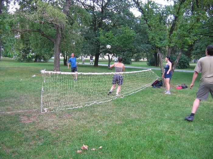 Skupinku hráčů jsem nalezl nikoliv na hřišti, nýbrž v parku na Letenské pláni mezi stromky, mezi kterými byla umně natažena síť (byť v nekonstantní výšce). Mé konzervativní představy o tom, že základem nohejbalu je rovný tvrdý povrch se po prvním odehraném setu ukázaly jako plané. Nepředvídatelně odskakující míč na zvlněném travnatém povrchu hru neznemožňuje, ale naopak jí mění ve více kreativní, pohybově náročnější a klade na hráče i jeho kopací techniku vyšší improvizační nároky. Dalším zajímavým zpestřením se jeví rozličné stromky, křoví a zejména větve zasahující do prostoru nízko nad hřištěm. Tyto přirozené přírodní překážky zajímavým způsobem mění trajektorii letícího míče, kupodivu často ku prospěchu nabíhajícího hráče. Zajímavým momentem bylo například podání, které se na straně soupeře okamžitě odrazilo zpět na stranu podávajících a soupeři se tak ocitli v roli diváků bez možnosti zasáhnout do hry. Rád bych vzpomenul také neobvyklé kopací techniky některých hráčů. Obdiv si získala zejména Verča se svým stylem ála Labutí jezero či neobyčejně kreativní Beruška odbíjející míč v pokleku přední stranou stehen. Dále je třeba ocenit Wlastu, který jediný znal pravidla a jeho drtící noha podávala stabilně kvalitní výkon. Pochvalu rovněž zaslouží Pojídač a Bidlo, kteří hráli velmi dobře v poli i v útoku. Klára nám opět dokázala, že ženy zvládají několik aktivit najednou, kupříkladu když diskutovala s Beruškou o záludnostech jakéhosi spárového lezení a současně mimoděk tvrdě smečovala. V neposlední řadě musím pochválit i zahraniční hráčku Widyi, která ač hrála nohejbal poprvé, několikrát zkušeně bodovala. Doufám, že příští týden uvidíme při hře i další borce a Letná tak zažije přehlídku neotřelých stylů. Takže ve čtvrtek v 18:00 ať tam všichni jste... a pláštěnky s sebou, včerejší průtrž sračen s orgánem málem rozfoukala přilehlou hospodu.