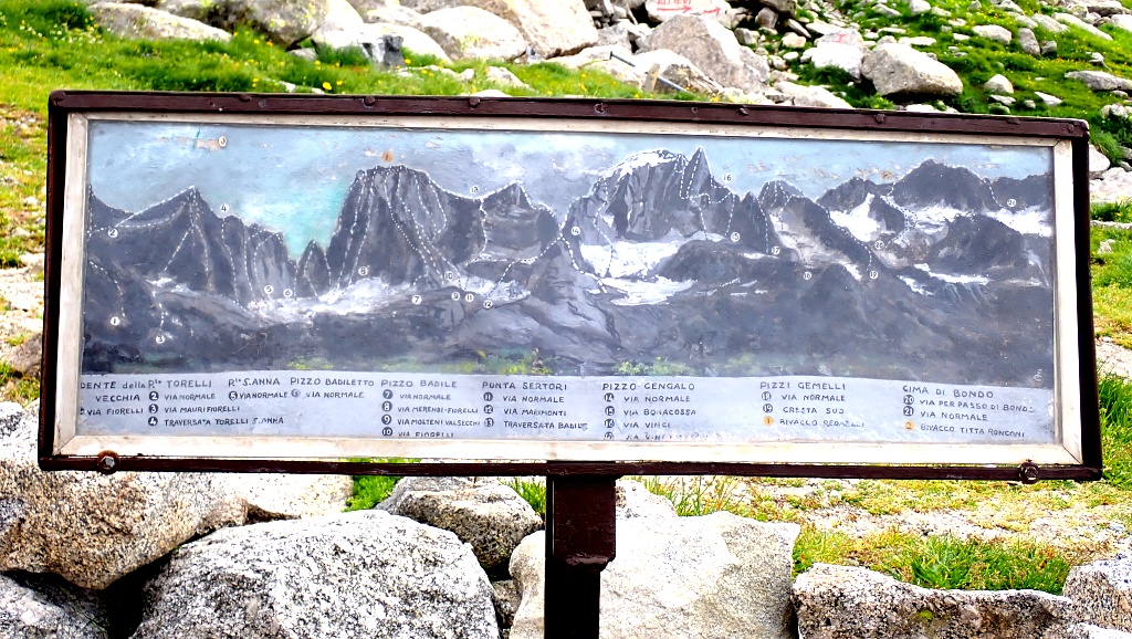 Orientační cedule před chatou Gianetti