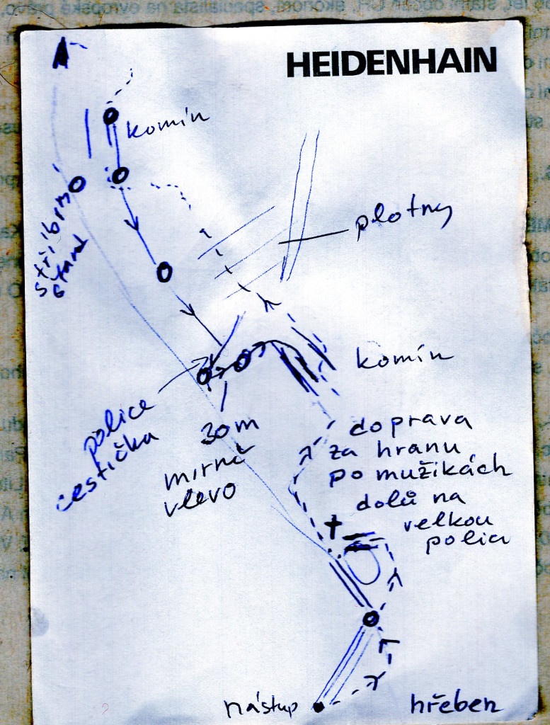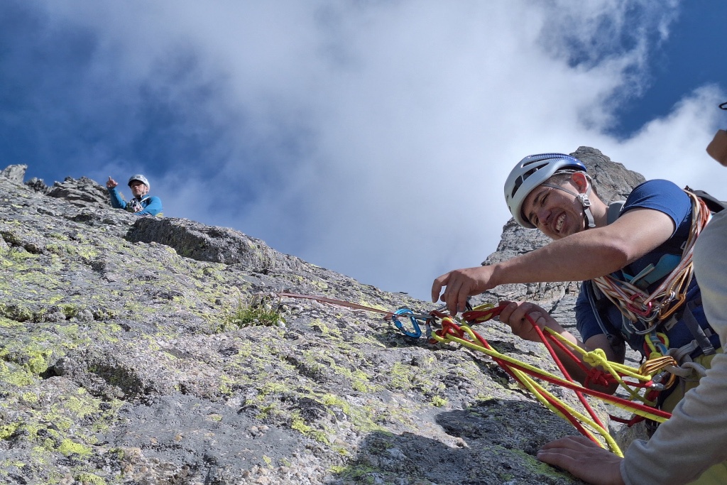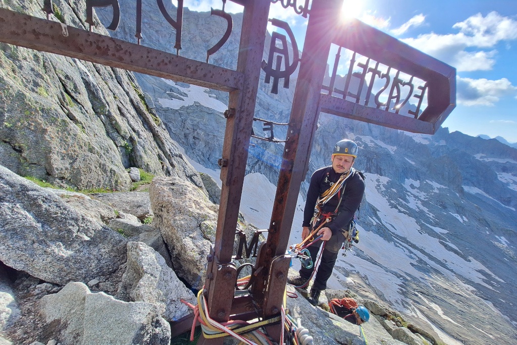 Železný kříž na normálce Badile slouží jako štand. Slaňuje sňatkový podvodník Michal.