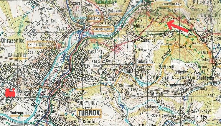 Z nádraží v Turnově po žluté značce přes řeku na náměstí. Pokračujeme po červené směrem na Zdenčinu vyhlídku. Buď se můžeme červené stále držet, sejít k Jizeře (pozor, ne přes, červená se tam dělí!), jít kousek po břehu a pak zase vystoupat na silnici, nebo to vzít zkratkou - ještě v Turnově značku opustit, jít po silnici přes Károvsko a za vsí se opět na značku napojit. Orientačně nejzajímavější je poslední kilometr - v Záholicích u roubené chalupy necháme červenou odbočit doleva do kopce a pokračujeme po rovině rozbitou asfaltkou na Rozumov. V místě, kde silnice vchází do lesa (a začíná stoupat) je vlevo oplocený pozemek se sešlou chatou. (Vpravo před stoupáním mohou automobilisté nechat stát své vozy.) Těsně před ním odbočuje pěšina do lesa. Jdeme po ní dnem skalnaté rokle (nikam nezahýbáme) a po třech stech metrech jsme v lomu.