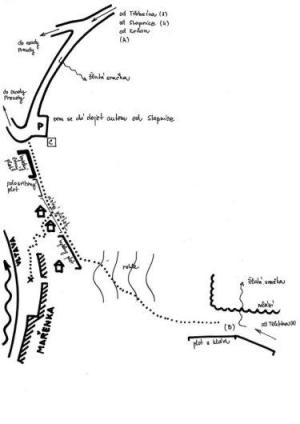 Jak se hledá Mařenka: Nejprve se podívej na mapu (Mařenka je tam chybně označena jako Bílá skála; skutečná Bílá skala však leží na protějším břehu a o kousek níž po proudu) - jsou tam vyznačeny nejdůležitější body v okolí: 1 - Štěchovice (sem se dá v případě nouze dojet, když už do Krňan nic nejede, cesta na Mařenku je ale odsud zdlouhavá a pořád po silnici; podél přehrady se projít nedá), 2 - Hradištko, u rybníčku (zastávka, kam také čas od času něco dojede), 3 - zastávka Krňany, rozcestí Třebsín, 4 - zastávka Krňany, Slapnice, 5 - zastávka Krňany, Teletín (všecno místa, odkud je to na Mařenu zhruba stejně daleko, u čtyřky - Slapnice - se odbočuje ze silnice při cestě autem), A a B - místa, kde se opouští žlutá turistická značka a pokračuje se rovnou za nosem a konečně c - místo, kam se dá za dobrých bahenních podmínek dojet autem (jinak se končí u statku Slapnice). Lehce rozluštitelným symbolem je označena hospoda, kde se dá po lezení osvěžit a poté nastoupit do autobusu.
