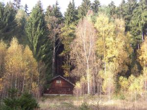 Opět jsem letos pro lezecké a společenské účely zamluvila myslivecký srub na Hrubé Skále, resp. na samotě na rozhraní lesa a louky, asi 10 minut pěšky od zámku, k věžím co by kamenem dohodil... Viz foto, teď je ještě vepředu přistavěná teráska se stolama a lavicema. Dole je jedna velká místnost s kamnama a kuchyňka (lednice, sporák, teplá voda, dostatek nádobí) a nahoře spaní.